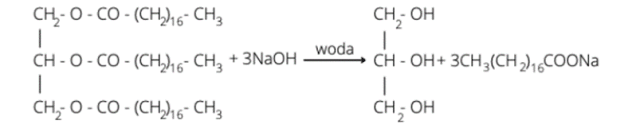 Proces usuwania tłuszczu wodorotlenkiem sodu to zmydlanie. W jego wyniku otrzymujemy glicerol i sól kwasu tłuszczowego. Reakcja zachodzi pod wpływem wody. Pamiętaj o uzgodnieniu równań reakcji.