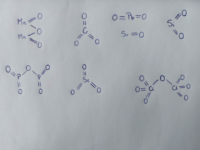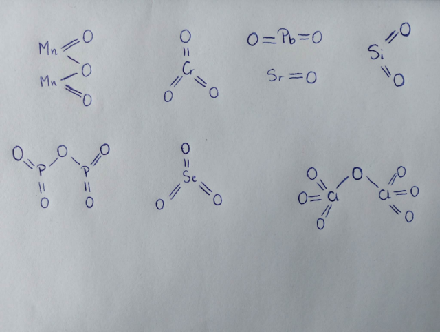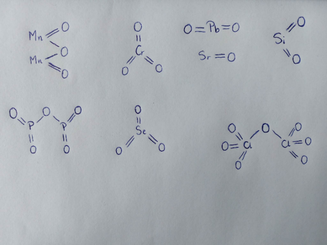 Wzory tlenków tworzy się, wypisując kolejno od tyłu symbole pierwiastków, biorące udział w wiązaniach. Następnie na podstawie skrzyżowania wartościowości dopisuje się indeksy stechiometryczne. Pamiętaj, jeśli wartościowości są podzielne przez jednakową liczbę, można je skrócić. We wzorach strukturalnych zapisuje się osobno odpowiednią ilość symboli każdego z pierwiastków i na podstawie wartościowości, zaznacza się, ile wiązań może wytworzyć do atomów pierwiastka przeciwnego.