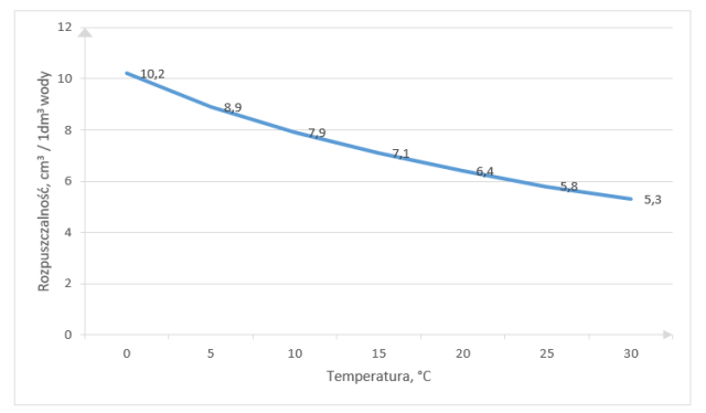 Napisz, dla jakiej temperatury wody rozpuszczalność tlenu wynosi 8,5 cm3 / 1 dm3 wody i 5,5 cm3 / 1 dm3 wody.