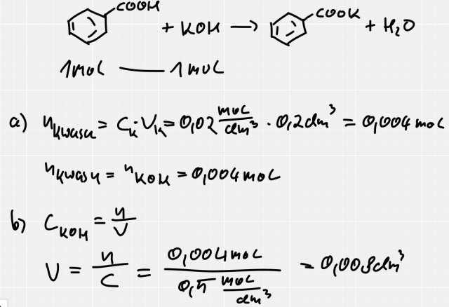 W tym zadaniu musisz obliczyć objętość roztworu wodorotlenku potasu, jakiej użyto do całkowitego zobojętnienia kwasu benzoesowego, jeżeli stężenie roztworu KOH wynosiło 0,5 mol/dm3