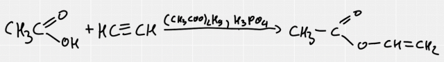 W tym zadaniu musisz napisać równanie reakcji chemicznej otrzymywania octanu winylu opisaną powyżej metodą.