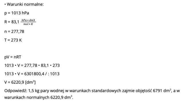 2. Para wodna to woda w stanie gazowym. Musimy obliczyć masę molową jednej cząsteczki wody (czyli dwóch atomów wodoru i jednego atomu tlenu), a następnie przyrównać tę wartość do 1,5 kg pary. Obliczamy w ten sposób liczbę moli n.