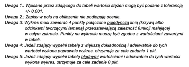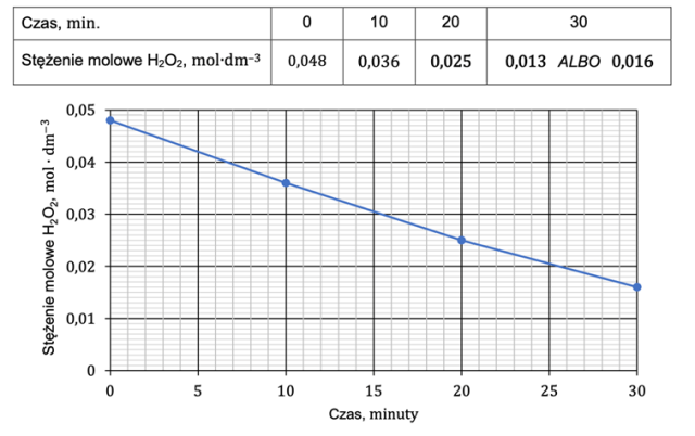 Uzupełnij tabelę poprawnymi wartościami liczbowymi, a następnie narysuj wykres przedstawiający zależność stężenia nadtlenku wodoru od czasu. Wartości stężeń zaokrąglij do części tysięcznych.