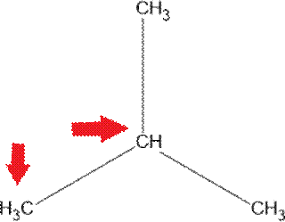 Strzałkami zaznaczono atomy węgla, do których może przyłączyć się chlor.