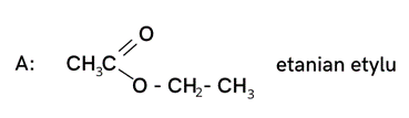 Alkohole ulegają utlenieniu mocnymi utleniaczami do kwasów karboksylowych. Wiemy, że nasz ester ma 4 atomy węgla, a alkohol C utlenia się do kwasu B. Oznacza to, że oba związki muszą mieć po dwa atomy węgla w cząsteczce (bo kwas ten musi stworzyć ester). Alkoholem o dwóch atomach węgla w cząsteczce jest etanol, a kwasem karboksylowym – kwas etanowy. Dla pewności liczymy masy molowe tych związków: