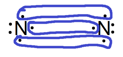 W cząsteczce azotu powstaje wiązanie potrójne poprzez stworzenie trzech wiążących par elektronowych. Cząsteczka azotu składa się z atomów tego samego pierwiastka, występuje więc tam wiązanie kowalencyjnie niespolaryzowane.