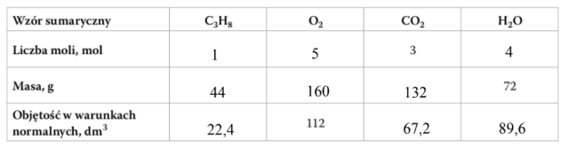Wiedząc, że w reakcji powstało 3 mole CO2 można zauważyć, że reakcja zachodziła zgodnie ze stechiometrią równania przedstawionego powyżej. W wierszu określającym liczby moli należy przepisać wartości współczynników chemicznych z równania, a następnie obliczyć na ich podstawie masy związków i objętość.