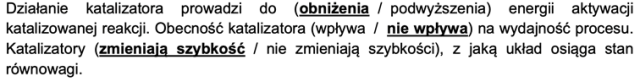 Katalizator powoduje zwiększenie szybkości reakcji poprzez obniżenie jej energii aktywacji, jednak nie wpływa na wydajność reakcji czy położenie równowagi.