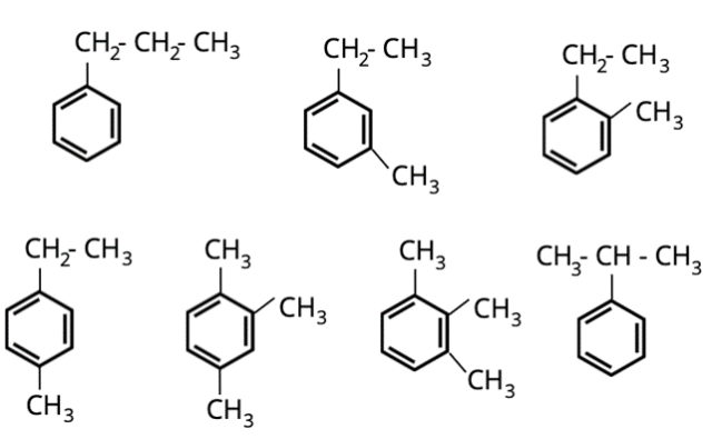 Izomery to związki, które mają taki sam wzór sumaryczny, ale różne wzory strukturalne. W pierwszym kroku ustal wzór sumaryczny mezytylenu – C9H12. Następnie poprzestawiaj podstawniki w taki sposób, by liczba atomów pozostała bez zmian, ale by zmianie uległa struktura związku. Pamiętaj, że wzorem sumarycznym benzenu jest C6H6 i dołożenie podstawnika do pierścienia powoduje usunięcie jednego atomu wodoru z pierścienia.