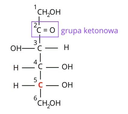 Cząsteczki cukrów prostych mają więcej niż jedno centrum chiralności. Przynależność do szeregu D lub L nie zależy już zatem od kierunku skręcania płaszczyzny światła spolaryzowanego. D-fruktozę zaliczamy do szeregu D, ponieważ asymetryczny atom węgla najbardziej oddalony od grupy ketonowej (C5) ma grupę -OH położoną po prawej stronie. Ten atom węgla nazywamy konfiguracyjnym i definiuje przynależność cukru do danego szeregu.