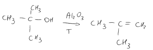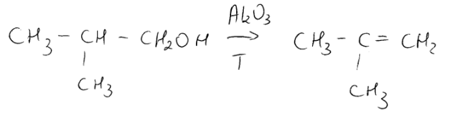 Rysujemy 2 izomery 2-metylopropanolu, podstawiając grupę -OH przy innych atomach węgla. W wyniku odwodornienia nastąpi odłączenie grupy hydroksylowej i otrzymanie 2-metyloprapenu.