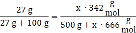 W przypadku dodawania hydratu do wody masa roztworu jest powiększana o całą masę hydratu, natomiast ilość substancji roztwarzanej jedynie o pewną część masy, którą dodajemy. Przyjmujemy niewiadomą x za liczbę moli substancji wprowadzanej, gdyż będzie ona taka sama dla związku bezwodnego (substancji rozpuszczanej) oraz całego hydratu. Do licznika wstawiamy masę Al2(SO4)3 wymnożoną przez liczbę moli (x), a do mianownika masę hydratu wymnożoną przez x. Całość równa się stałemu stężeniu liczonemu ze wzoru