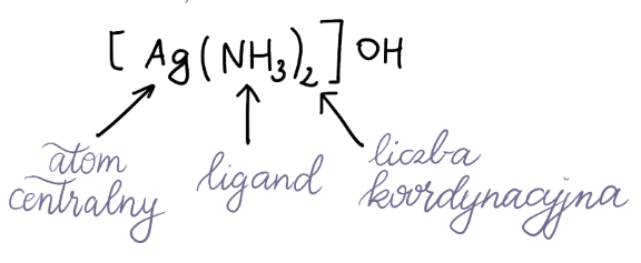 Atomem centralnym jest tutaj atom srebra (Ag). Ligandem jest amoniak (NH3). Liczbą koordynacyjną jest liczba 2, która określa liczbę NH3.