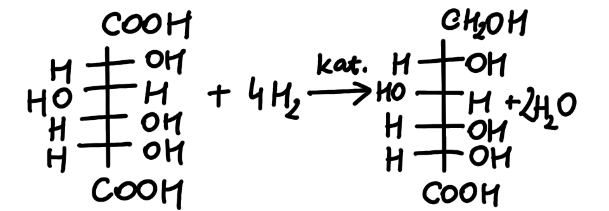 W tym zadaniu należy podać równanie reakcji chemicznej polegającej na katalitycznej redukcji kwasu glukarowego wodorem.
