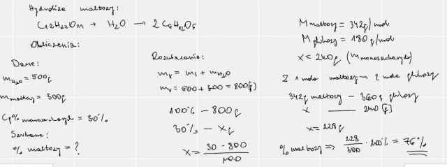 W tym zadaniu musisz napisać równanie zachodzącej reakcji chemicznej i obliczyć, ile procent w procentach masowych maltozy uległo hydrolizie.