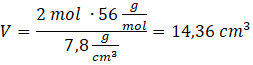 W tym zadaniu oblicz objętość próbki, która zawiera 2 mole atomów żelaza o gęstości 7,8 g/cm3.