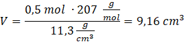 W tym zadaniu oblicz objętość próbki, która zawiera 0,5 mola atomów ołowiu o gęstości 11,3 g/cm3.