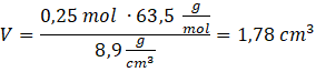 W tym zadaniu oblicz objętość próbki, która zawiera 0,25 mola atomów miedzi o gęstości 8,9 g/cm3.