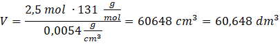 W tym zadaniu oblicz objętość próbki, która zawiera 2,5 mola atomów ksenonu o gęstości 0,0054 g/cm3.