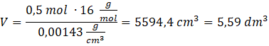 W tym zadaniu oblicz objętość próbki, która zawiera 0,5 mola atomów tlenu o gęstości 0,00143 g/cm3.