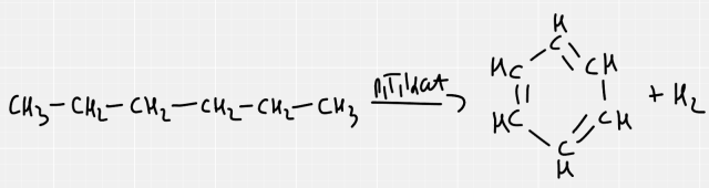 W tym zadaniu musisz napisać równanie reakcji chemicznej zachodzącej podczas reformingu n-heksanu. Zastosuj wzory półstrukturalne.