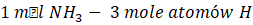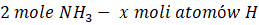 W jednym molu NH3 znajdują się 3 mole atomów wodoru, więc w 2 molach NH3 znajduje się x moli atomów wodoru: