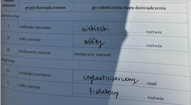 W tym zadaniu musisz uzupełnić poniższą tabelę, opisz barwę zawartości każdej probówki po zakończeniu danego etapu doświadczenia.