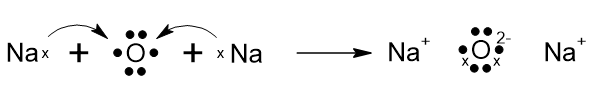 Dwa atomy sodu oddają po jednym elektronie atomowi tlenu, przez co zarówno atomy sodu, jak i tlenu uzyskują dublet elektronowy.