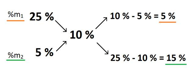 Metodą krzyża możemy szybko wyliczyć stosunek, w jakim należy zmieszać dwa roztwory, aby otrzymać roztwór o zadanym stężeniu.