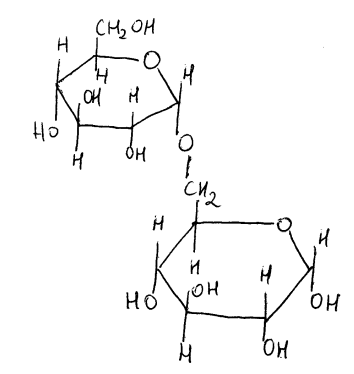 Rysujemy dwie cząsteczki glukozy. Od pierwszego atomu węgla w pierwszej cząsteczce rysujemy z pozycji α wiązanie w dół do szóstego atomu węgla w drugiej cząsteczce.