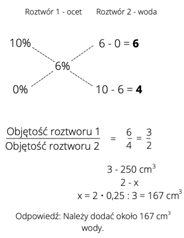 Do wykonania takich zadań korzystamy z krzyża św. Andrzeja. Pozwala on na wyliczenie stosunku objętościowego (w przypadku stężeń procentowych) substancji, które tworzą mieszaninę o konkretnym stężeniu. W lewym górnym rogu należy umieścić stężenie pierwszego roztworu, pod spodem drugiego (woda ma stężenie 0%, a to nią rozcieńczamy ocet). Na środku umieszczamy docelowe stężenie. Następnie odejmujemy zgodnie ze schematem. Wynik to stosunek objętości roztworu 1 do roztworu 2. Wiedząc, że 3 „części” podanego roztworu stanowić będzie ocet (o objętości 250 cm3), ułóż proporcję, by poznać objętość 2 „części”, które stanowi woda.