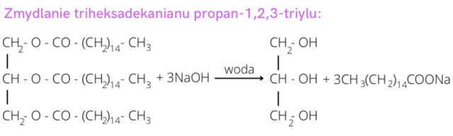 W pierwszym kroku zapisz wzór triheksadekanianu propan-1,2,3-triylu (tripalmitynianu glicerolu). Jest to tłuszcz zbudowany z glicerolu i trzech reszt kwasu kwasu palmitynowego – C15H31COOH. Hydroliza w środowisku zasadowym (zmydlanie) pozwala na uzyskanie glicerolu i mydła, czyli soli kwasu tłuszczowego.