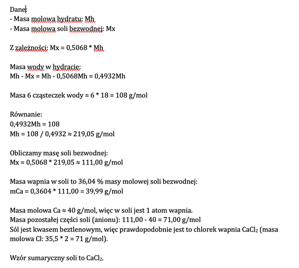 Wyznacz masę molową soli X oraz określ jej wzór sumaryczny, mając informację, że wapń stanowi 36,04% masy molowej i że sól pochodzi od kwasu beztlenowego.