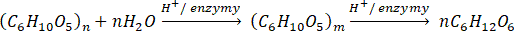 W reakcji hydrolizy skrobi powstają początkowo dekstryny (m<10), a później cząsteczki glukozy.