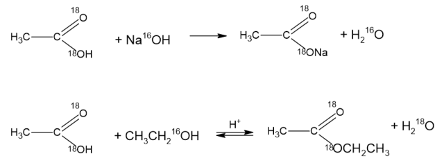 Wiadomo, że w reakcji kwasu karboksylowego z alkoholem powstaje ester i woda, więc można zapisać równanie – tu trzeba pamiętać o tym, z czego powstaje cząsteczka wody (z jakich części obu związków).