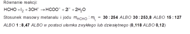 Zapisz w formie jonowej skróconej sumaryczne równanie opisanego utleniania metanalu jodem w środowisku alkalicznym i określ stosunek masowy, w jakim metanal reaguje z jodem.