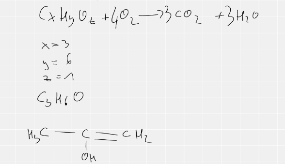 Z powyższej zależności możemy dobrać współczynniki stechiometryczne w powyższej reakcji, korzystając z prawa zachowania masy. Z wyznaczonych współczynników wyznaczamy x, y i z.