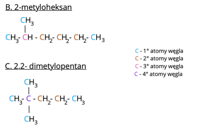 W pierwszej kolejności policzmy, ile jest atomów węgla w związku: trzy pierwszorzędowe + trzy drugorzędowe + jeden trzeciorzędowy = 7 atomów węgla → na tym etapie możemy już odrzucić odpowiedzi A oraz D, ponieważ: