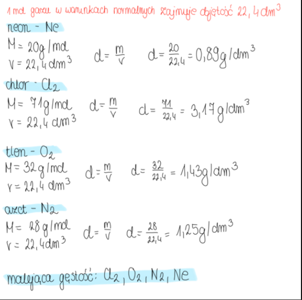 Oblicz gęstości neonu, chloru, tlenu i azotu w warunkach normalnych i uszereguj te gazy zgodnie z malejącą gęstością.