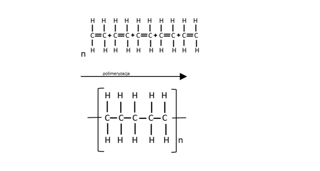 W tym zadaniu musisz napisać za pomocą wzorów strukturalnych równanie reakcji obrazujące sposób, w jaki cząsteczki etenu łączą się ze sobą i tworzą polimer. Uwzględnij co najmniej pięć cząsteczek monomeru.