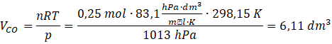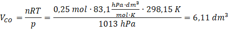 Z równania Clapeyrona, oblicz objętość tlenku węgla(II), wiedząc, że warunki normalne to ciśnienie 1013 hPa, a temperatura 298,15 K.
