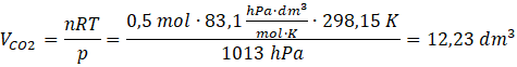 Z równania Clapeyrona, oblicz objętość dwutlenku węgla, wiedząc, że warunki normalne to ciśnienie 1013 hPa, a temperatura 298,15 K.