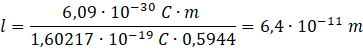 Podstaw dane z zadania do wzoru, pamiętając, by uwzględnić udział wiązania jonowego oraz, że ładunek elektronu wynosi 1,6 ∙ 10-19 C: