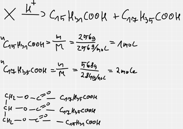 Po obliczeniu stosunku molowego produktów hydrolizy, stosunek molowy tych związków w cząsteczce tłuszczu musiał być taki sam.