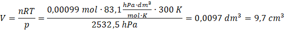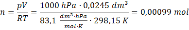 Z równania Clapeyrona oblicz liczbę moli, wiedząc, że warunki standardowe to p = 1000 hPa, a T = 298,15 K: