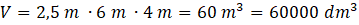 Na początku oblicz objętość i zamień ją na dm3, wiedząc, że 1 m3 = 1000 dm3: