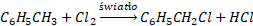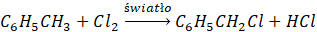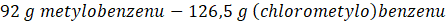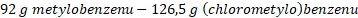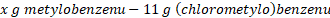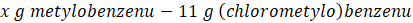 Następnie na podstawie stechiometrii reakcji chemicznej i informacji, że powstało 11 g (chlorometylo)benzenu oblicz masę metylobenzenu, który uległ reakcji: