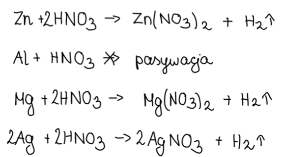 Uzasadnienie: Glin w stężonym kwasie azotowym(V) ulega pasywacji, a pozostałe badane metale reagują z tym kwasem.