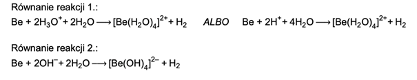 Zapisz w formie jonowej skróconej równania reakcji berylu: osobno z H3O+ i osobno z OH−, pamiętając o powstawaniu jonów kompleksowych.
