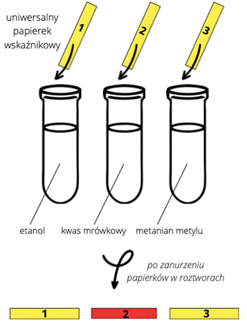 Odczyn etanolu i metanianu metylu jest obojętny, na co wskazuje brak zmiany zabarwienia papierka wskaźnikowego. Kwas mrówkowy ma odczyn kwasowy – stąd papierek barwi się na czerwono. Dysocjacji ulega tylko kwas mrówkowy: HCOOH <—H2O—> H+ + COOH-